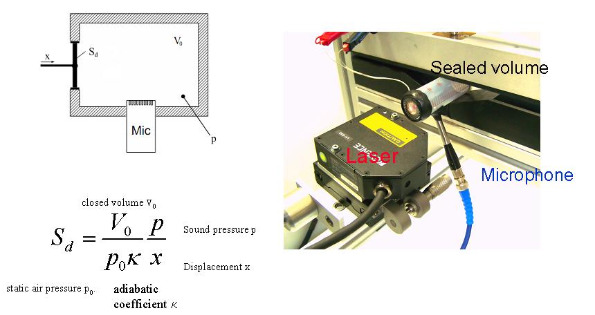 | 应用笔记AN32描述了如何测量有效辐射面积Sd: 运行密闭箱中的换能器,测量密闭空气中的声压和音圈位移。腔体必须密闭,不然会影响精度。 |