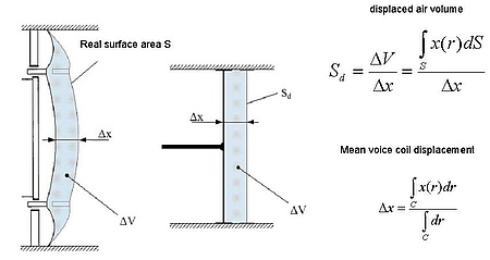 有效辐射面积Sd描述了随音圈速度移动并产生与辐射器低频(此时表面所有点都同相)运行时相同体积速度的活塞面积。对于低音扬声器,其折环的宽度比音盆的内径要小,有效辐射面积可以用折环内外径的平均值得到的面积来近似。这种近似对微型扬声器和耳机/耳麦中的驱动单元并不起作用,因为折环面积相对较大,其弯曲的几何形状会使折环偏移时产生非线性衰减。
