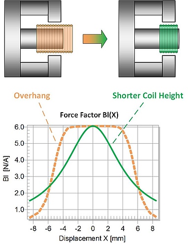 由于存在损坏和增加失真的高风险,过去许多用于提高效率的设计选择(例如使用非常柔软的悬挂或非线性严重的电机)都不适用。这些问题可以通过自适应非线性控制解决,因为可以补偿增加的信号失真,并且保护系统可以防止任何过载。 例如,在保持相同的极板、磁铁和其他换能器部件的同时,可以大大降低音圈的高度,这样可以显著提高效率和电压灵敏度,因为电阻Re和振动质量Mms减小了。