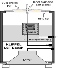 因此,需要进行快速且严格的EoL测试,以确保质量稳定,并提供有效的过程控制手段来保证高良率。KLIPPEL Analyzer 3的QC卡是微型扬声器EoL测试的最佳选择,它提供内置的DC耦合功率放大器、电压和电流感测以及两个麦克风输入。使用QC标准软件,可以在不到一秒时间内测试频率响应、谐波和脉冲失真以及T/S参数。通过添加PNI的完全抗扰性可以增强此功能。悬挂系统的不对称性和音圈静止位置可通过独有的电机+悬挂检查(MSC)组件进行测试(仅基于大信号电学测量)。添加KA3激光卡和位移激光传感器可提供更强大的功能,例如峰值和直流位移测试(DCX)以及包括Bl(0)和Mms(TSX)在内的全机械T/S参数测试,而无需增加额外的测试时间。