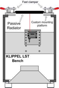 对于测试无源辐射器, 建议使用LST Pro, 因为生产中的质量和刚性偏差都可能会变动。基于物理模型以及定义的相对参考单元(“黄金单元”)来测量得出质量偏差和刚性偏差。 此参考单元可以根据R&D规格进行选择, 或者在一批参考单元中进行自动黄金单元选择。所有接下来测量的设备均与参考单元相关。如果参考振动质量已知(如通过MSPM或SPM中的附加质量方法测定), 则可以以绝对值或百分比方式得到参数偏差。如果无源辐射器不是圆形的, 则需要将自制的平台安装到LST测试台的顶部。为保证可重复性条件, 外框架必须固定起来(例如使用夹紧钳)。