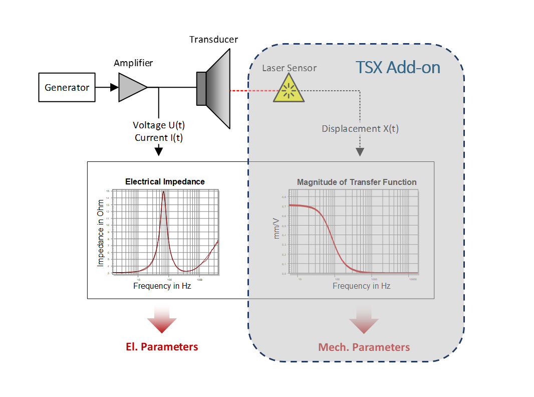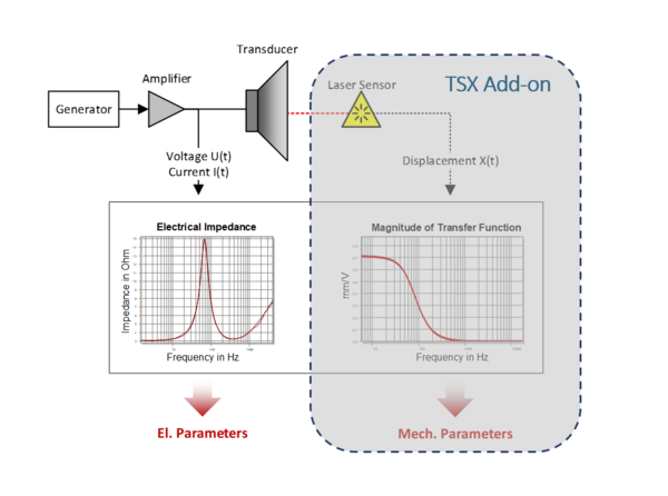 - Use TSX add-on module: As an add-on feature of the IMP task, TSX can be activated by selecting “Laser” as the mechanical calibration method in the IMP task (TSX license required). This method enhances the impedance-based lumped parameter fitting of the IMP with state-of-the-art laser displacement measurement. With dedicated stimuli and advanced fitting algorithms, including suspension creep, accurate transducer parameters such as force factor Bl, moving mass Mms, mechanical stiffness Kms, and losses Rms can be determined in one step. This method is ideal for comprehensive production monitoring process control, and root cause analysis.