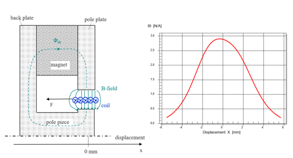 In the above figure, the voice coil is centered in the magnetic field (optimal position), and the Bl (x) curve is very symmetrical with a maximum value close to X=0. But as long as the voice coil moves, the effective Bl value will decrease and cause compression and signal distortion (harmonic distortion, intermodulation distortion) in the sound pressure output.