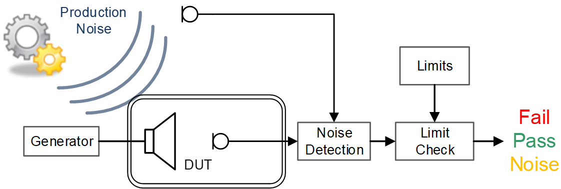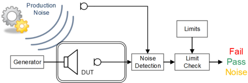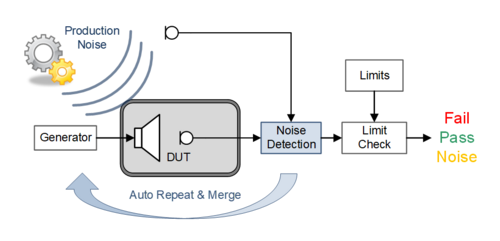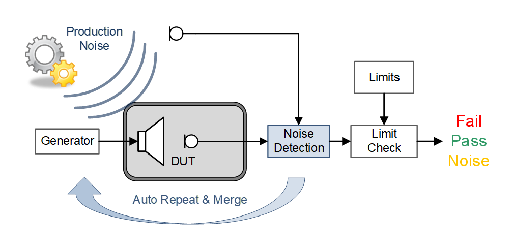 In the previous article, it was mentioned that during QC testing on the production line, a second microphone should be added, along with a test box, to isolate production noise and vibration. This will help monitor the noise level and accurately determine if the measurement is corrupted due to noise disturbance, rather than showing a false negative result and labeling the Device Under Test (DUT) as defective. Now, the question arises: what should be done if the verdict is "NOISE" due to environmental noise disturbance? The conventional method is to repeat the test until completely undisturbed, which is unsuitable for modern automated production lines and increases measurement time and costs. But what if there was a way to automatically repeat this test of the disturbed results?