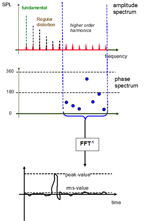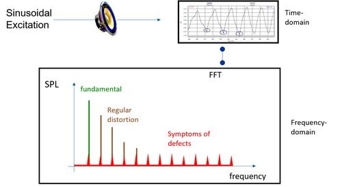 When testing a speaker for impulsive distortion according to IEC 60268-21, an excitation signal (chirp) is used to excite the speaker. The measurement microphone records the response signal, which is converted to the frequency domain using FFT. However, to extract high-frequency distortion components, a tracking filter with a variable cutoff frequency is used in the time domain. By this approach, the phase information is considered which helps to detect impulsive defects with maximum sensitivity.