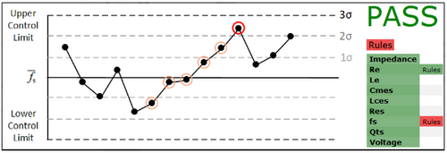 In addition to using preset control rules, custom control rules can also be defined based on the verdict history, the time course, and statistical values (mean and standard deviation) of single value test results such as fs, Re, or voice coil offset.