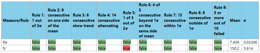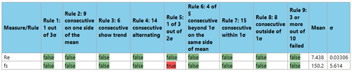 The overall indicator of the control rule depends on the activated individual rule results. As shown in the figure above, the overall rule indicator is true (shown in red) because the control rule for action fs is enabled and its results are true. The QC software also provides a detailed rule results table that specifically shows the individual rule results for each action.