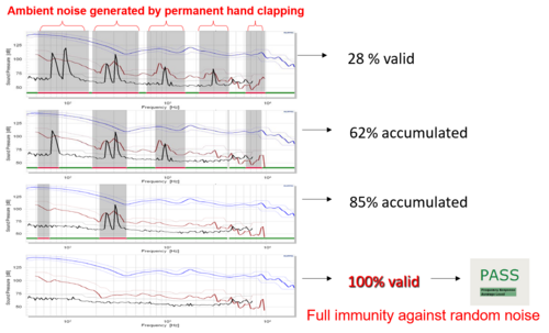 As mentioned above, the PNI module relies on reliable noise detection. This smart repeating and splicing technology is a key element of ultra-fast testing, providing immunity against random production noise. This feature can be applied not only to the SPL task to ensure the measurement of frequency response, polarity, harmonic distortions, and Rub&Buzz, but also to check the Air Leak Detection (ALD) results.