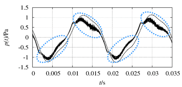 The air noise produced by leaks is mainly a stochastic process. The air pressure in the cabinet is modulated by the driver displacement and synchronized with the stimulus. The following example shows the waveform of a box excited by a sinusoidal stimulus at 60 Hz with a sealed enclosure (dashed line) and a leaky enclosure (solid line). The time signal shows that the air leak produces additional distortion components at the maximum positive and negative sound pressure. The repeated measurement at the leakage (the other solid line) shows that the fine structure of the distortion is different and stochastic, but the generated position is the same and has a deterministic envelope.