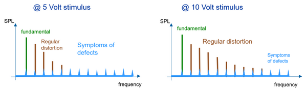 However, while extracting high-frequency components, regular nonlinear distortion, which can also be found in good units, is included. This distortion increases with excitation voltage. The defect symptoms, however, do not increase significantly with voltage and have almost constant energy spread over the whole audio spectrum. Therefore, with a high level of voltage, defect symptoms can be masked by regular nonlinear distortion.