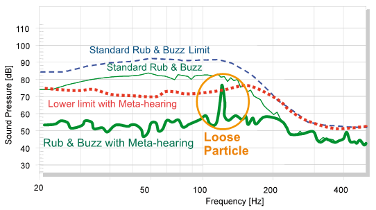 The Klippel solution, known as the Meta Hearing Technology (MHT), is a patent-protected technology that employs adaptive modelling to learn the inherent “regular” distortion of good units, such as a golden DUT. This technology then separates the distortion caused by speaker defects from the measured distortion to actively compensate for the masking effect of regular distortion. Compared to standard impulsive distortion analysis, the MHT solution offers up to 20 dB more sensitivity in detecting potential problems as early as possible. For instance, the click energy produced by loose particles is relatively low and can be completely masked by the regular distortion generated by motor and suspension nonlinearity. However, these defects can be detected by MHT before they worsen and become audible. Therefore, the MHT solution is crucial in detecting potential problems in the early stages so that they can be prevented from becoming serious issues.