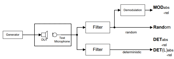 Therefore, KLIPPEL has developed a special technique to measure the air noise generated by turbulences at leaks and ports, which has been implemented in the Air Leak Detection (ALD) module of the KLIPPELQC System. This technique exploits some properties of the modulated noise visible only in the time domain: the envelope of the turbulent air noise is deterministic, which corresponds to the periodicity of the excitation signal. Through adaptive filtering, asynchronous demodulation of the air noise signal, and averaging of the harmonic components of the envelope, the absolute and relative distortion levels can be provided to qualify and quantify air leakage (modulation distortion MODabs/MODrel, as well as deterministic leakage distortion DET(L)abs/DET(L)rel). Additionally, this technique can characterize other speaker defects, such as voice coil hitting the backplate (deterministic distortion DETabs/DETrel) and loose particles (Random). The following picture shows the different measures and how they are achieved.