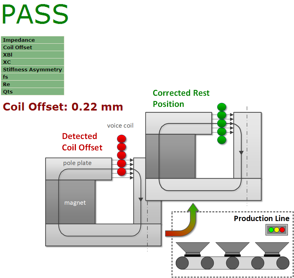 KLIPPEL's solution is to add the Motor and Suspension Check (MSC) task to EoL test sequence. This module is protected by patent, only the voltage and current at the speaker terminals under large signal excitation need to be measured. The linear and nonlinear parameters (Bl (x) and Kms (x)) for transducers on the production line can be quickly identified by modelling with speaker nonlinear parameters, from which the meaningful single value parameters such as voice coil offset and suspension asymmetry are derived. This provides valuable information for taking immediate actions to fix the causes of loudspeaker distortion, maximum output limitation or stability issues.