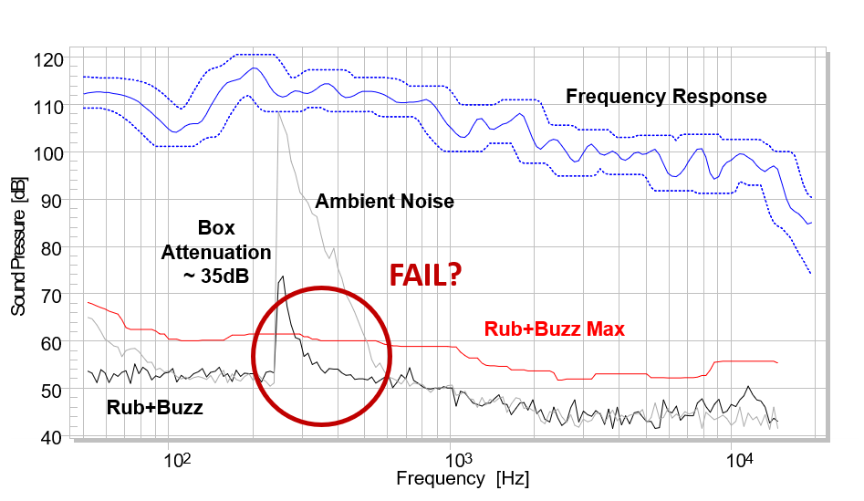 Below is an example of a well-designed and well-made test box that provides almost 35dB attenuation. During testing, the DUT (Device Under Test) was found to be "Good". However, when clapping hands simulated an impulsive ambient noise, the test results showed that this disturbance caused Rub&Buzz at the main test microphone in the test enclosure to exceed the allowed limit by 15dB, resulting in a false Fail verdict.