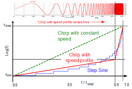 Compared to the stepped sine signal, the slope of the chirp in the time-frequency mapping at low frequencies is greater than that of the stepped sine, but smaller at higher frequencies. The optimal sweep speed is limited by the maximum resonator quality factor at lower frequencies. This slow speed is not required at high frequencies and unnecessarily increases the measurement time. For fast testing of electro-acoustical devices, the ideal stimulus is a combination of the dense excitation inherent in the chirp and the time-frequency mapping of the stepped sine.