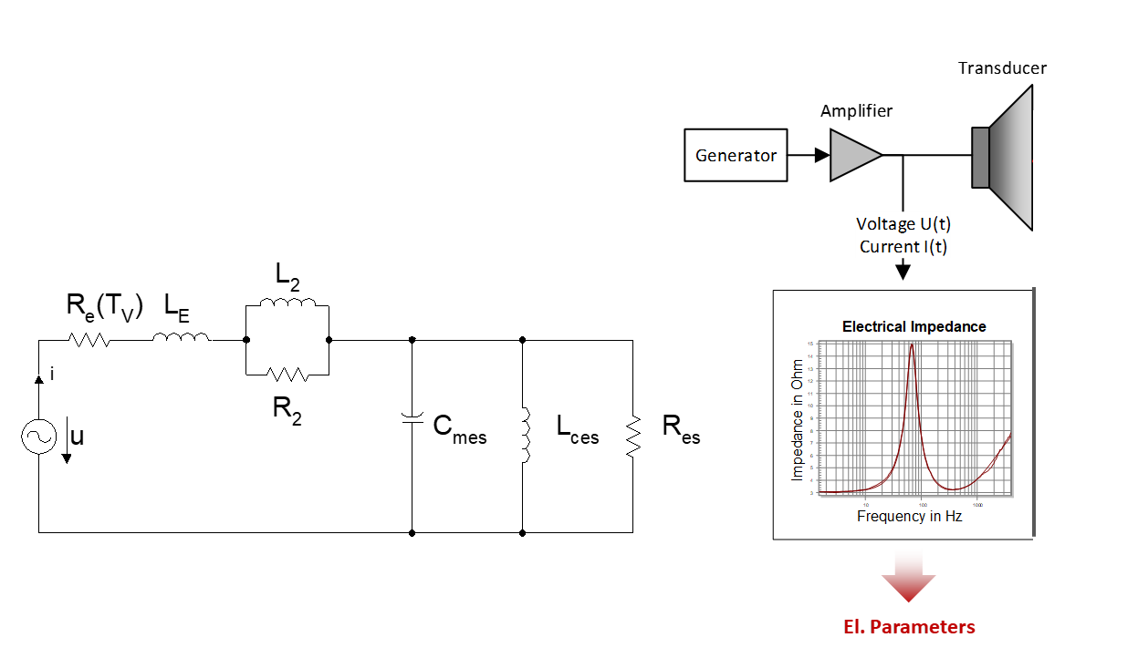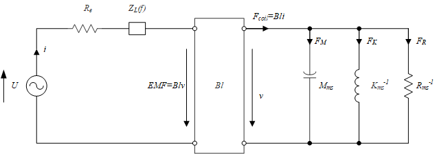 At low frequencies, the wavelength is much larger than the geometrical dimensions of the transducer. The mechanical system can be modeled by lumped parameters, as shown in the electro-mechanical equivalent circuit model below. The left side of the circuit represents the electrical properties of the voice coil, while the right side describes the mechanical system of the transducer – a damped mass-spring-resonator.