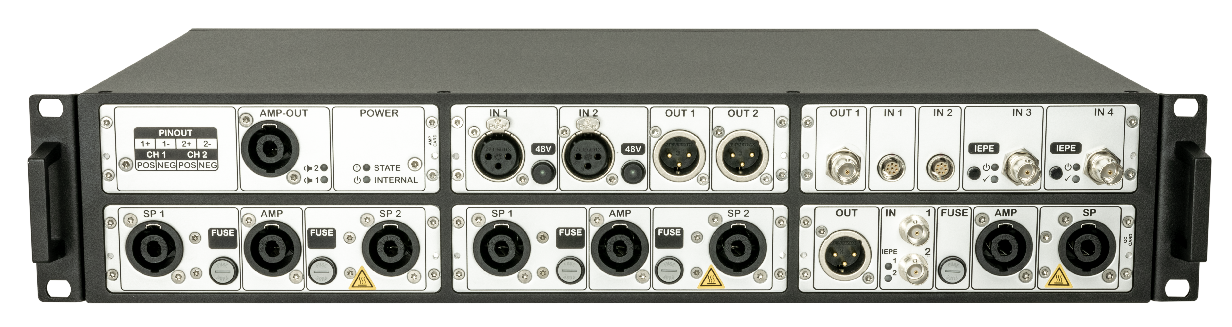 包含2个SpeakON扬声器通道,1个SpeakON功放输入