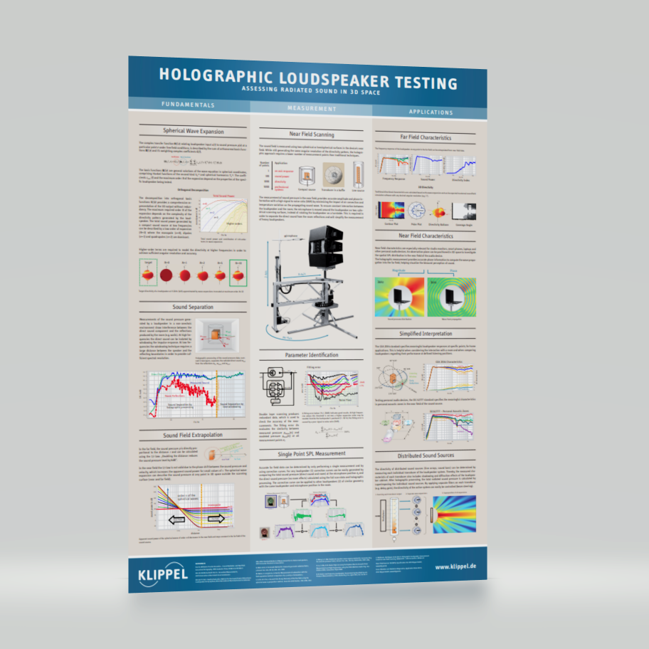 The fifth poster explains how to perform accurate, standard-compliant acoustic measurements even in untreated rooms. It is a very useful and compact overview of the measurement applications of the IEC 60268-21 and summarized the KLIPPEL LIVE web seminars about acoustical testing of modern audio devices.