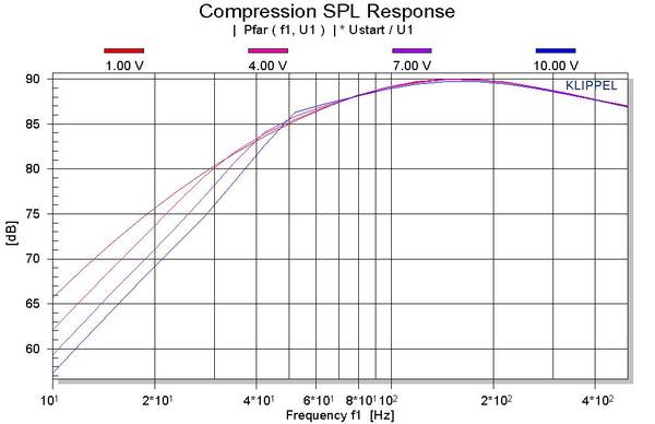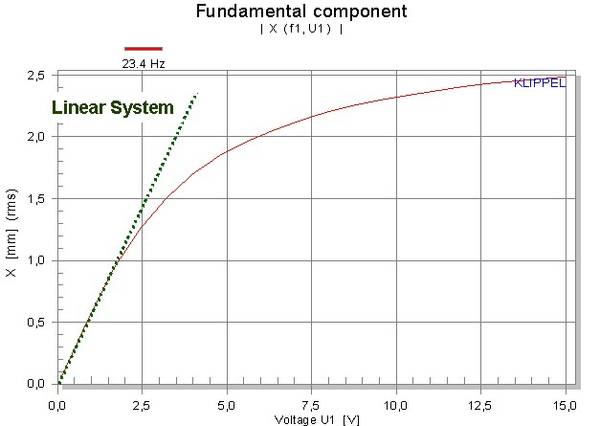 The figure to the left shows the amplitude of the voice coil displacement (fundamental component) versus terminal voltage. At low voltages (U < 2 Volt rms), there is almost a linear relationship between input and output amplitude as predicted by linear parameter modelling. At higher amplitudes, the nonlinearities in the motor and suspension system cause a soft limiting of the output amplitude which limits the maximal output but which also protects the voice coil former against bottoming at the back plate.