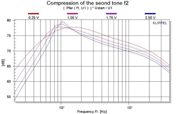 The figure to the left shows the short-term measurement of the same loudspeaker, but the single-tone was replaced by a two-tone stimulus. The first tone f1=20 Hz represents a bass signal. The frequency of the second tone f2 is varied over the audio band. At higher voltages, the first tone generates high displacement and the loudspeaker nonlinearities reduce the output of the high-frequency tone f2 by 4 –10 dB at low and high frequencies. Only at the resonance the force factor nonlinearity Bl(x) reduces the electrical damping, and the acoustical output will be increased by 3 dB.