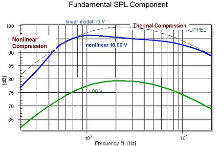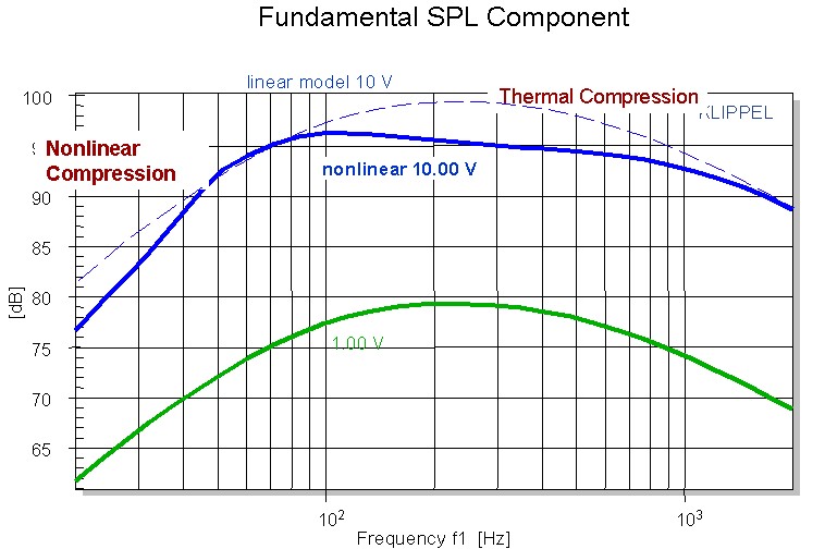 The SPL response of the fundamental component at high amplitudes differs from the response predicted by a linear model based on Thiele/Small parameters. The amplitude difference can be expressed by a compression factor in dB. The compression is caused by transducer nonlinearities and the increase of the resistance Re corresponding with the increased voice coil temperature due to dissipated electrical input power. Short-term and long-term measurements are recommended in standards to differentiate between the two mechanisms and to define the maximal acoustical output. Improving the linearity of a transducer usually requires a compromise in thermal power handling.