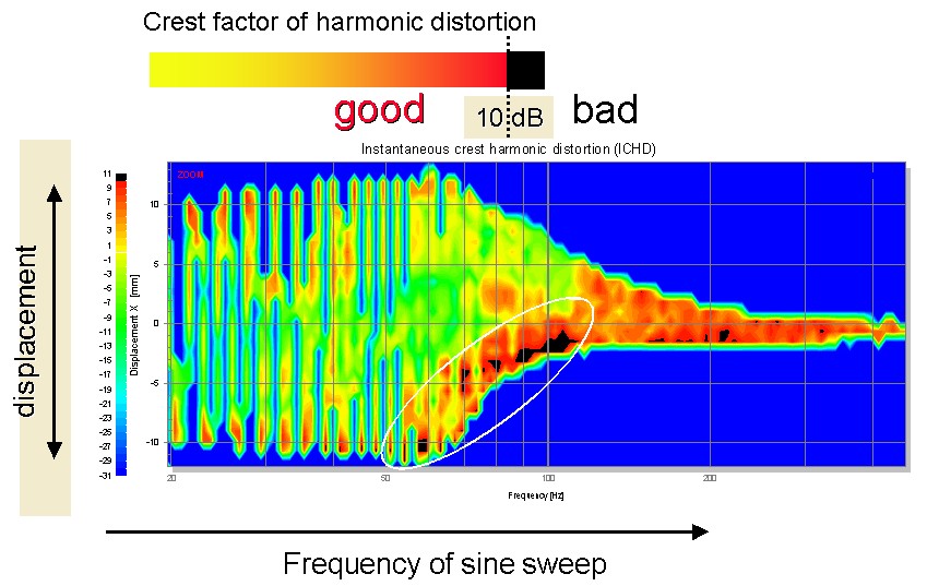 The figure to the left shows the detection of Rub & Buzz and other impulsive distortion within the R&D SYSTEM using the TRF PRO module. For a sinusoidal sweep stimulus (chirp), the instantaneous crest factor of the higher-order harmonics is plotted as a color versus voice coil displacement and instantaneous frequency. For regular distortion the instantaneous crest factor is always low but for impulsive distortion this value exceeds 10 dB, and the crest factor is plotted in black color. The figure reveals impulsive distortion between 60 – 100 Hz at the negative turning point where the peak displacement varies from –10 mm down to 2 mm. This is typical for voice coil rubbing because at those positions the acceleration is maximal and tilts the voice coil former.