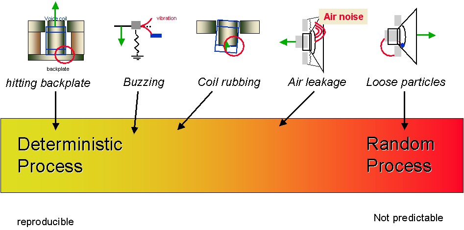 Irregular defects, such as voice coil rubbing in the gap, buzzing parts, loose particles, wire beating, hard limiting of the surround, bottoming of the voice coil former at the back plate, air noise in leaky enclosures, generate impulsive distortion which have not much energy but which generate a wide-band spectrum. Conventional spectral analysis as used for the THD is not a sensitive way for detecting those distortions because the distortion occurs only within a fraction of a period. Time domain analysis and active compensation of the regular motor distortion provide a sensitivity which exceeds human hearing. To use the high sensitivity of the measurement technique in a production environment, the system should also provide some means for detecting ambient noise and for coping with it. Advanced signal processing can exploit unique properties of the irregular defects giving more diagnostic information about the cause of the problem.