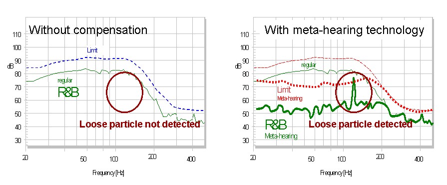 The figure to the left illustrates the masking of the loose particle defect by regular motor and suspension distortion. The right figure shows the Meta-hearing technology of the KLIPPEL QC System where the regular distortion in the R&B measure is compensated and the spike of a loose particle can reliably be detected by a PASS/FAIL limit (red dotted curve) which is below the R&B values without compensation. This active compensation can not be accomplished by a human ear.