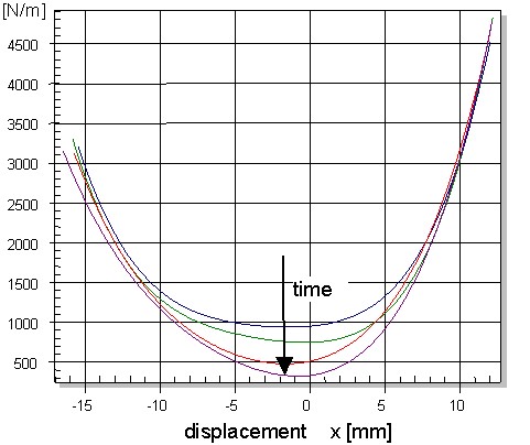 The figure to the left shows the variation of the stiffness of a spider versus measurement time measured by using the SPM module. After 10 hours of operation in the large signal domain, the stiffness at the rest position is decreased to 40 % of the initial value while the stiffness at high excursion is almost constant.