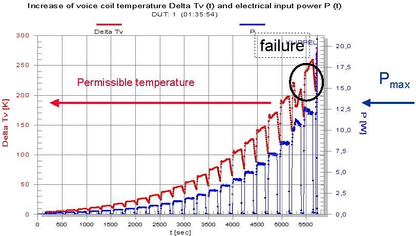 The figure to the left shows the increase of the voice coil temperature and input power versus measurement time using pink noise switched on and off according to fixed cycle times and increased by a voltage profile. The increase of voice coil temperature shows significant variation at 200 Kelvin which corresponds with voice coil rubbing at the pole tips. This limits the maximal input power for this stimulus to 13 Watts.