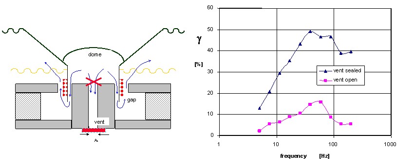 Increase of voice coil temperature: The figure to the left shows the heat transfer of a woofer in a loudspeaker system with and without vent in the pole piece. The air below the dust cap will be ventilated through the open vent, and the convection cooling of the coil is low giving a low bypass factor (pink curve in right diagram). After sealing the vent (shown in the left sectional view), the air is pressed through the air gap, and the high velocity of the air particles increases the bypass factor to 50 %.