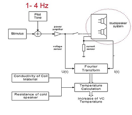 The voice coil temperature can be monitored without using an additional sensor by measuring the dc resistance and considering the material properties of the voice coil. The dc resistance corresponds with the electrical impedance at very low frequencies. An additional pilot tone (1 – 4 Hz) has to be added to the stimulus (test signal or audio signal) to ensure a reliable measurement of the dc resistance which is not affected by the motional impedance and inductance of the coil. The short thermal time constants in small transducers (microspeaker, tweeter) require a fast method and dedicated signal processing to measure the dc resistance as fast as possible.