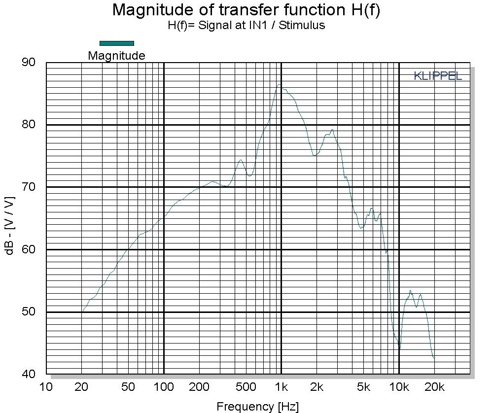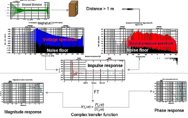 LPM uses a multi-tone complex as stimulus which is perfect for measuring the electrical impedance, the mechanical transfer function Hx(f)=X(f)/U(f) between displacement and voltage and the sound pressure response Hp(f) in the small signal domain. | |