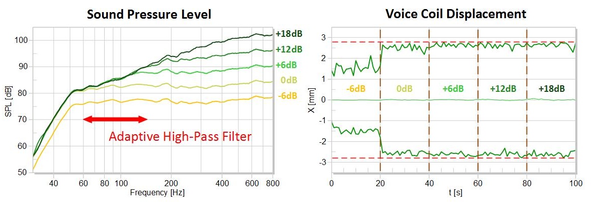 While the thermal protection reduces the level of the entire input signal to reduce the electrical power, the mechanical protection system only attenuates low frequencies where the voice coil excursion is high. Hence the maximum allowed excursion is fully utilized because the audio level can still be increased while only the excursion is restrained. This technique allows the transducer to be reliably protected without latency and avoids artifacts generated by compressors and limiters that impair the perceived sound quality.