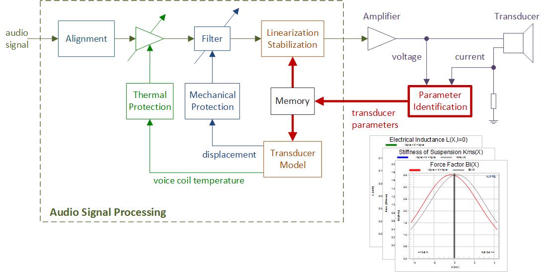 While playing music in on-line mode, KCS constantly monitors voltage and current at the speaker terminals to continuously adapt the internal model with time-varying transducer properties, such as variances of mechanical stiffness, voice coil temperature and voice coil position. Based on the identified parameters, the nonlinear transducer model estimates precise state information such as voice coil displacement, which is required by the protection systems.