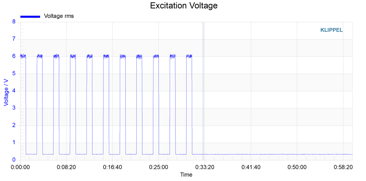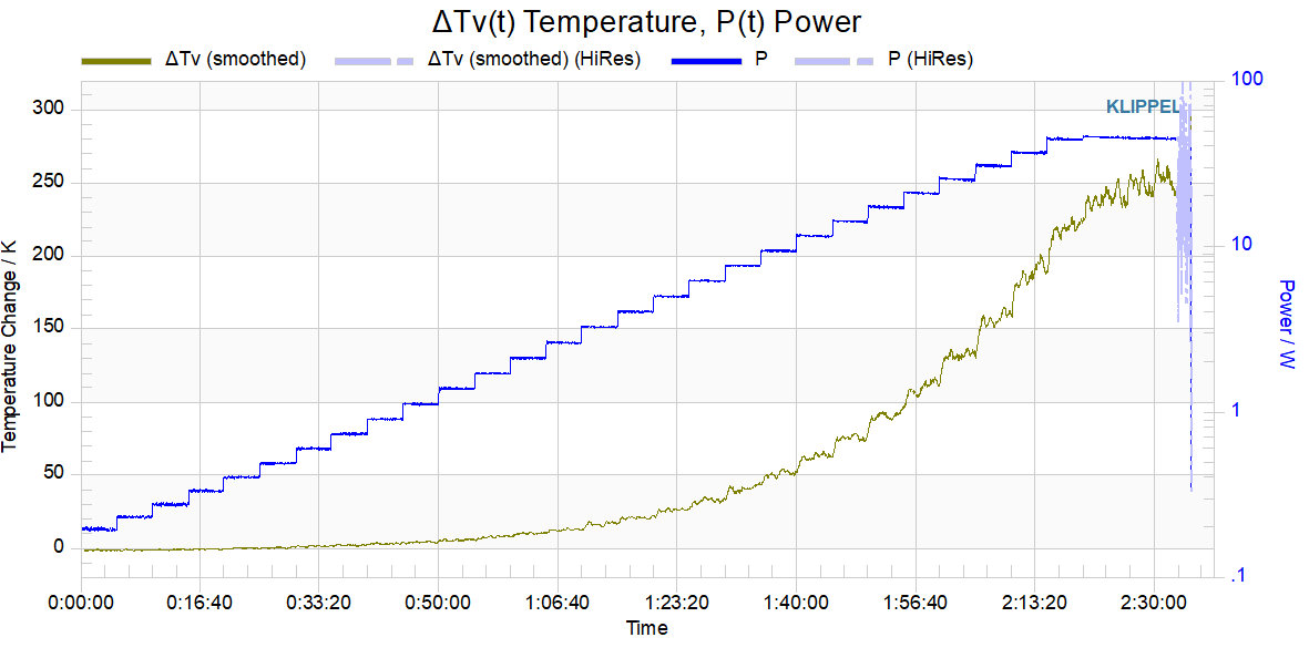 In this example, the test level is increased every 5 minutes by 1 dB steps up to a maximum test level of 25V / 45 W. Note the logarithmic y-axis for power. The device under test, a small automotive woofer that is specified with a 12V max rms level, withstands more than twice that specified level for about 5 minutes. The coil temperature at the breakdown was measured at about 250°C. Note, that the coil temperature is averaged over the coil, usually the outer parts of the coil are less cooled and may be considerably hotter than the inner parts.