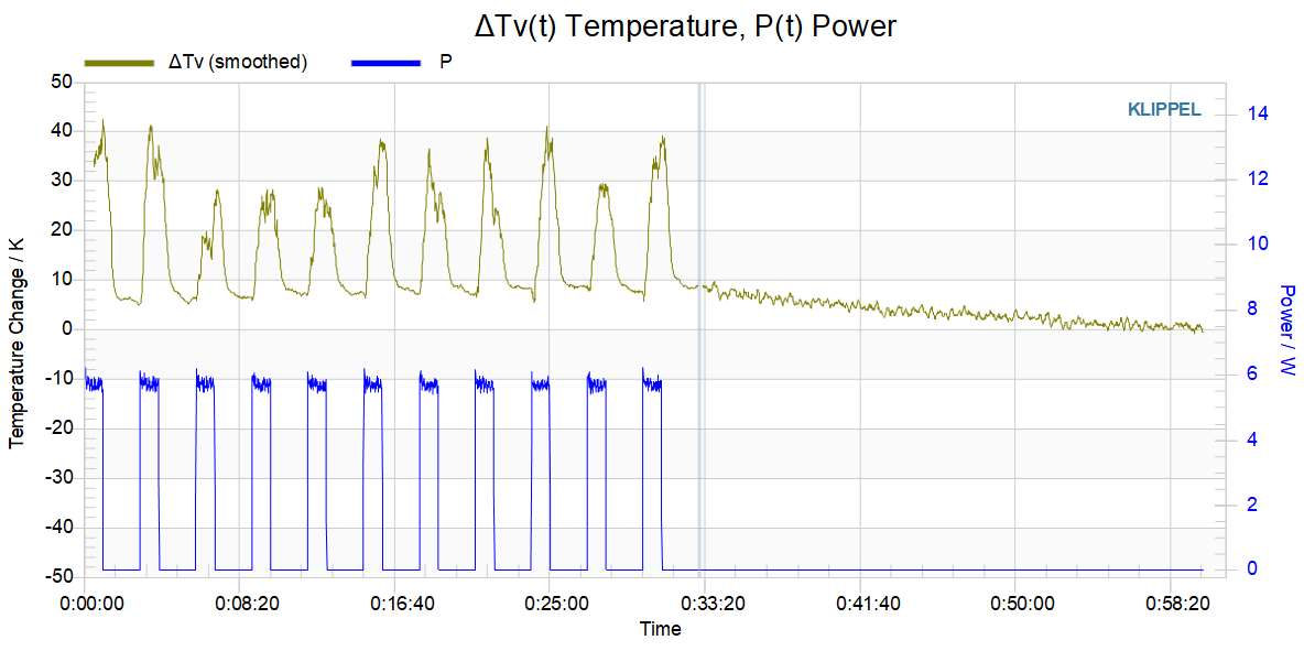 After the cooling phase, the voice coil temperature quickly heats up, increasing the input resistance of the DUT and therefore reducing the input power within the On-phase.