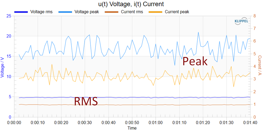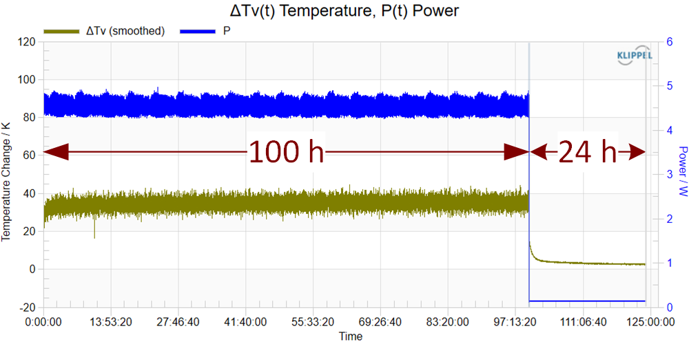 The voice coil temperature is closely related to the real input power supplied to the transducer. Note the dual Y axis in the chart. Both state variables plotted versus measurement time give important information for defining admissible maximal input power. For a continuous playback test the steady state temperature for the given level can be assessed.