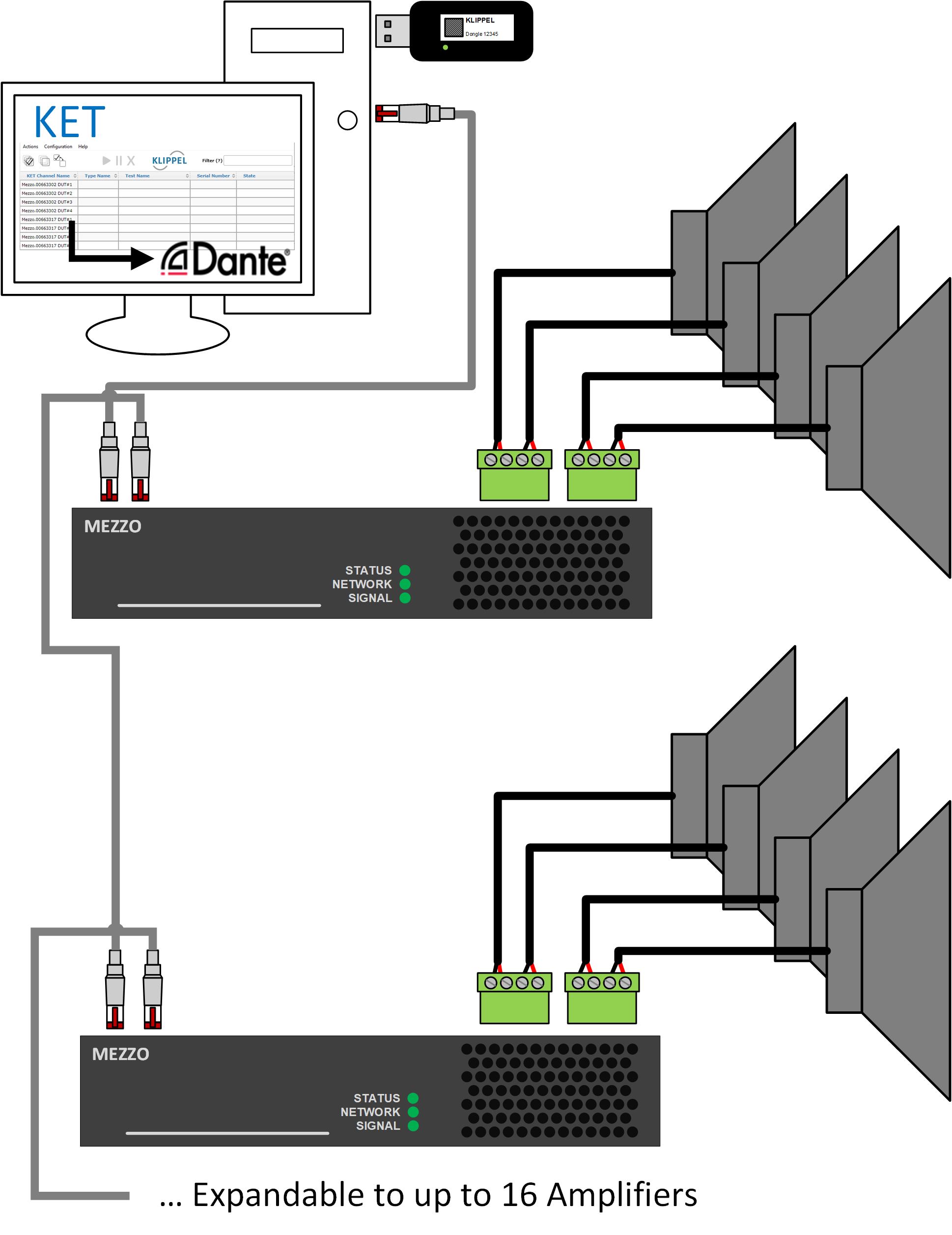32 DUTs can be measured using one PC. Even a higher channel number up to max. 64 channels, depending on PC performance and Dante® Interfaces, is possible (see references). Each DUT test can be individually started, muted and terminated. Each DUT can have its own test signal and configuration. The current test status of all DUTs can be visualized in a dashboard. The dashboard can be easily accessed via any browser in the local network. Dante® technology is used for streaming data via a (wired) network connection.
