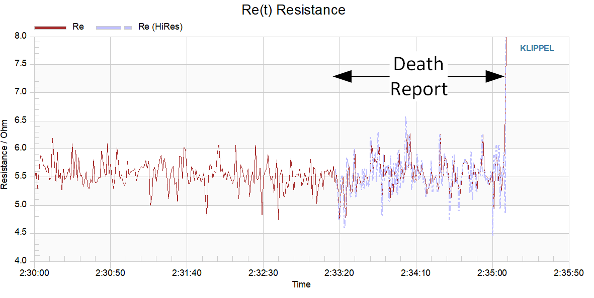 A death report provides high-resolution data just before a detected failure. A ring buffer of 100 seconds length stores results at the highest available rate, here about 200ms. This may reveal the root causes for a malfunction. In this example, the coil suddenly broke and the resistance jumped up quickly causing an open circuit failure.