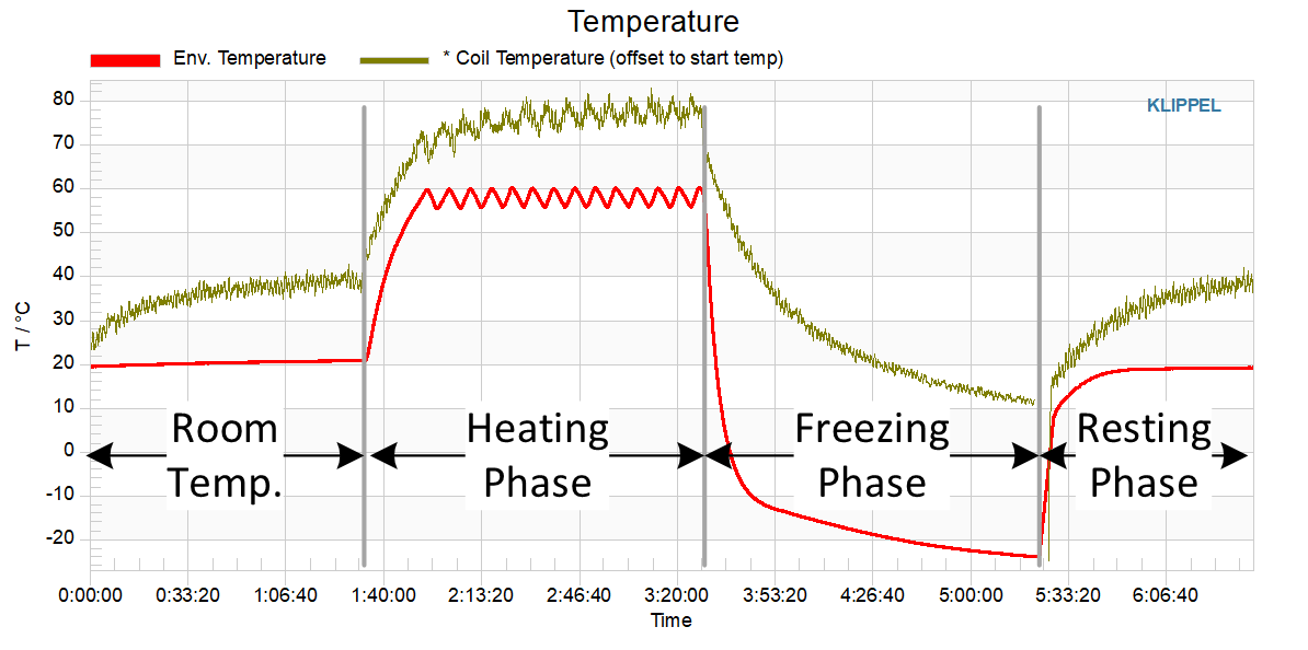 A temperature sensor (red) measures the environmental temperature in a climate chamber while the voice coil temperature is plotted in brown. The test consists of 4 phases at room temperature, a heating phase, a freezing phase, and a resting phase, about 90 minutes each. Here the environmental heat and cold add additional thermal stress to the voice coil and the DUT, resulting in high coil temperature even at moderate excitation levels.