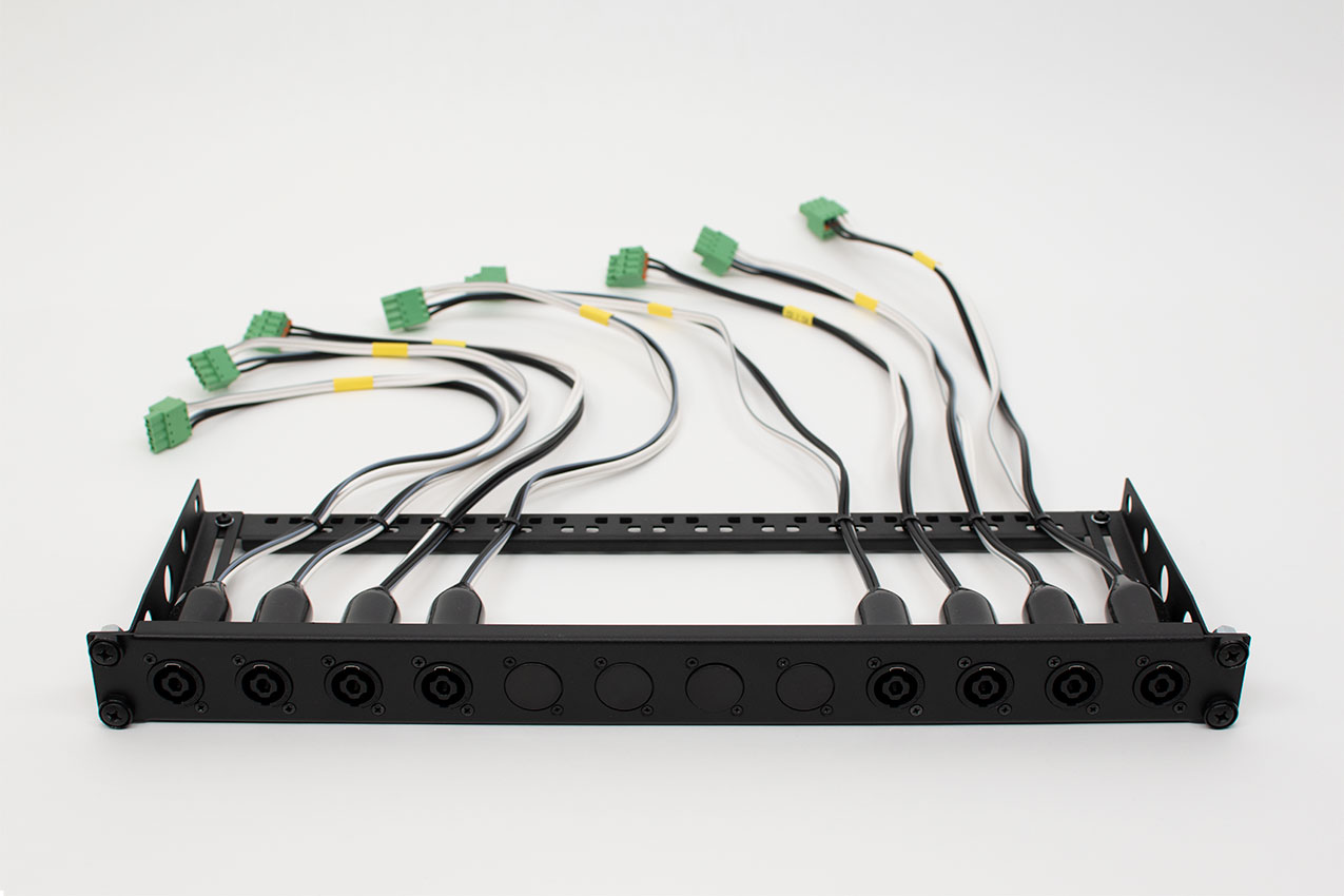 - For cost-effective and environmentally friendly setups one speakON-connector at the Patch Bay feeds two DUT channels. The Patch-Bay with its 8 speakON-connectors feeds 16 DUTs
