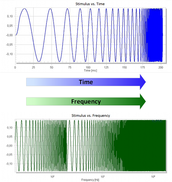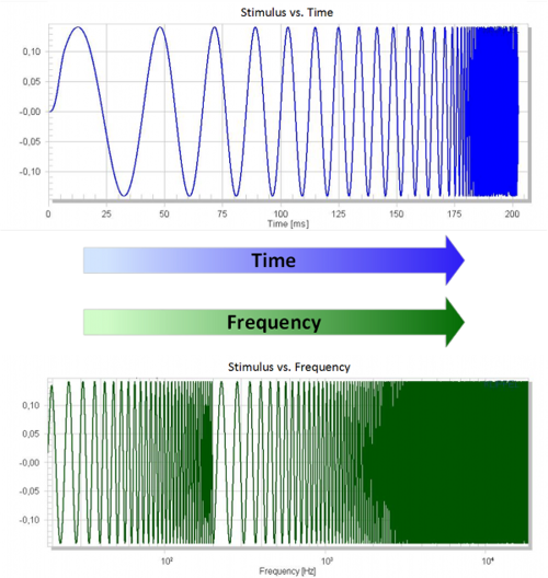 The figure below illustrates a sinusoidal sweep stimulus (chirp) with a speed profile which is optimal for loudspeaker measurements. 90 % of the available measurement time (180 ms) is used to measure the loudspeaker below 200 Hz, but only a very short measurement time (20 ms) is required to measure the loudspeaker at higher frequencies. The chirp, using the speed profile, excites the loudspeaker at all frequencies and provides sufficient energy to activate Rub & Buzz defects.