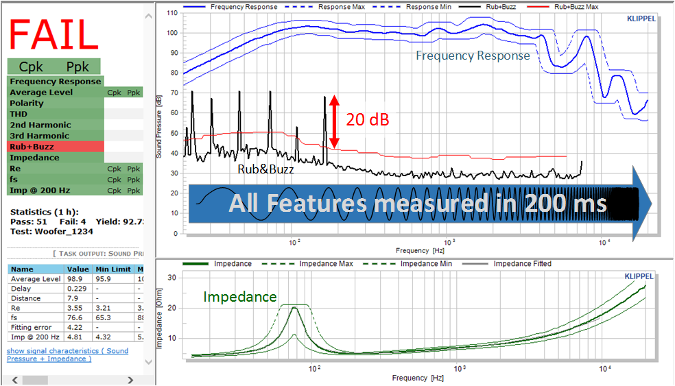 The KLIPPEL Analyzer System provides unique QC measurements optimized for End of Line (EoL) testing that provide maximum sensitivity for defects while requiring minimum measurement time. These fast measurements use special stimuli such as a continuous sine chirp with a flexible sweep speed, which is reduced at frequencies where the loudspeaker needs a longer excitation. Voice coil rubbing, loose particles, air leakage and other irregularities, which generate impulsive distortion that is hardly audible in a noisy production environment, can now be reliably detected. Defects such as these become worse over time and will finally be detected by the end user if not sorted out at EoL.