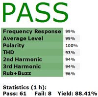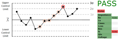 The QC software features optional control rule sets (control charts) to monitor the stability of production process. Comon control rule sets (Nelson/WeCo rules) are available as pre-defined rule sets. Additonally, custom control rules can be defiend based on the verdict history, the time course and statistical values (mean and standard deviation) of single value test results such as fs, Re or voice coil offset.