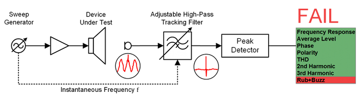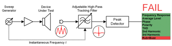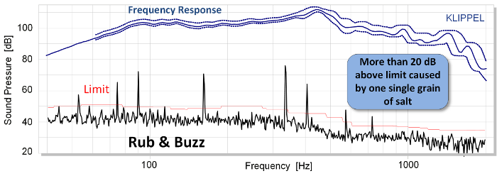 The KLIPPEL QC system offers outstanding sensitivity for all kinds of irregular distortion caused by mechanical defects. Such defects are easily audible by end users, badly affecting the audio quality. Thus they need to be detected as early as possible. High-order distortion is analyzed in the time domain by exploiting full spectral amplitude and phase information to detect even the tiniest impulses from loose particles, which may be 80 dB below the main signal level. Even if such defects are hardly audible at the component test, they should not be ignored since they might become worse in the final application.
