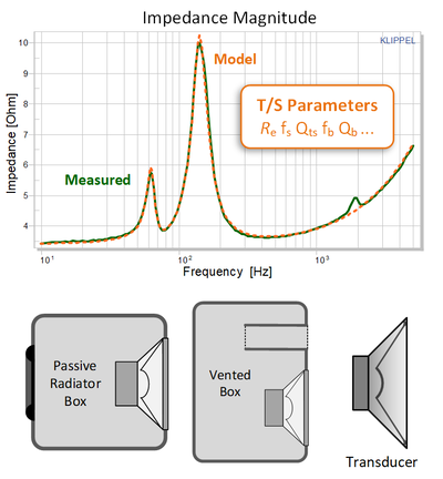 The Impedance Task (IMP) identifies the lumped parameters of the equivalent circuit of the transducer, including Thiele/Small, creep and lossy inductance parameters. It complies with IEC standards 60268-5 and 60268-22. A multi-tone or chirp stimulus is used to measure the voltage and current using Klippel measurement hardware: Klippel Analyzer KA3 (QC Card or Speaker Card) or Production Analyzer. To ensure accurate measurement in the small signal domain, distortion in current and voltage are measured and checked against admissible limits.