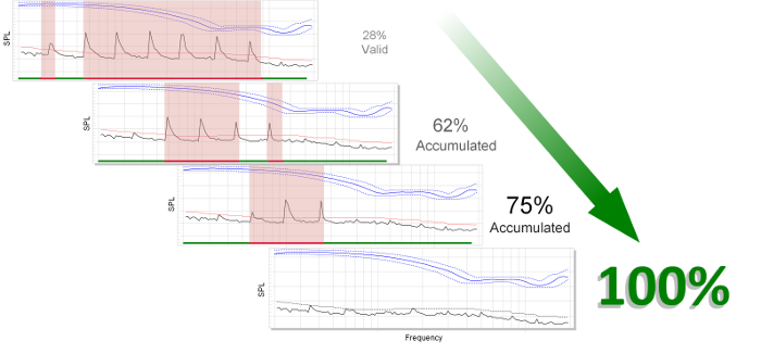 Ordinary techniques like a simple repeat approach, where the signal is repeated until one completely undisturbed test finishes, or averaging, which impairs sensitivity, does not solve the problem. In contrast, the unique splicing technique ensures full production noise immunity while maintaining full sensitivity, even if each single measurement is corrupted.