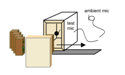Completely sealed test enclosures are also very beneficial for testing smaller loudspeaker systems (e.g. for multimedia). Here the loudspeaker system and the test microphone are located inside the test enclosure. Although this shielding provides good attenuation (between 20-30 dB), high peak values of ambient noise corrupt conventional measurement techniques. The second ambient noise microphone and the algorithms used in Noise Immunity ensure full sensitivity for rub and buzz defects, loose parts and air leaks.