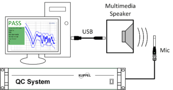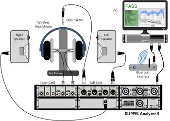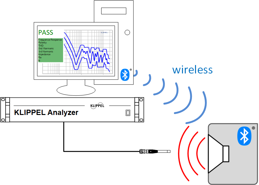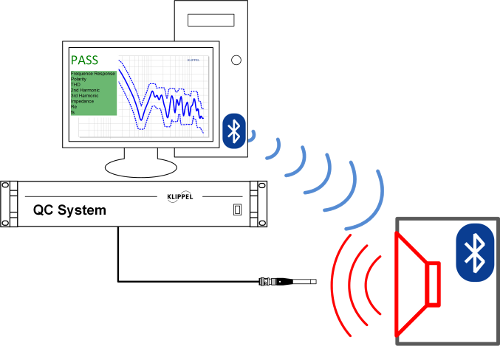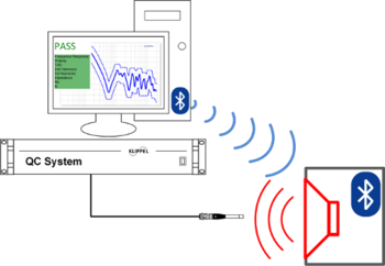 This setup is similar to the USB speaker example above, but the test signals are transferred wirelessly via Bluetooth. This can be done using a stand-alone dongle providing a dedicated audio device such as the MegaSig U980 Bluetooth interface or Windows Bluetooth radio. Automatic pairing, profile and volume control is optionally provided by External Devices (EXD) Bluetooth Audio functionality.